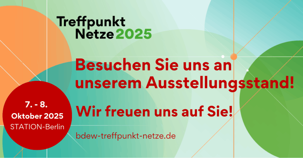 Am 7. und 8. Oktober 2025 präsentieren wir uns gemeinsam mit unseren Partnern Trium Novem und PIEA beim Treffpunkt Netze 2025, der Leitveranstaltung der deutschen Netzwirtschaft. Wir freuen uns auf Ihren Besuch!